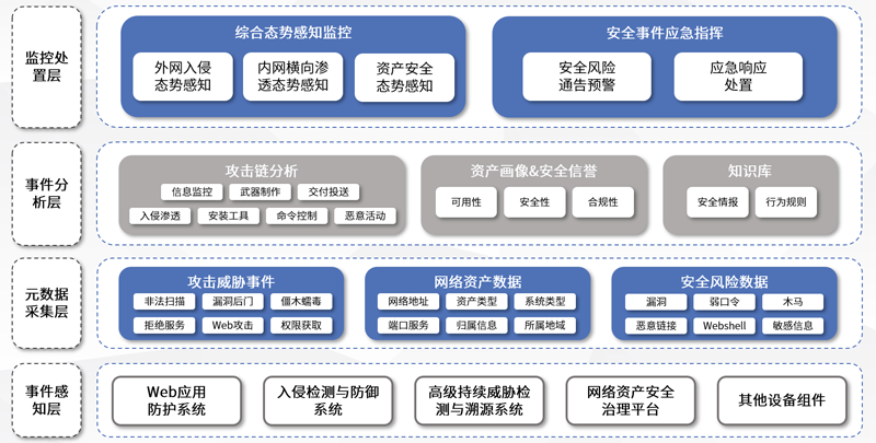 网络安全形势日益严峻,面对海量的威胁事件和更高的安全需求,传统的解决方案已无法完全覆盖安全态势分析和统一管理的要求,必须要结合多维大数据关联分析的技术手段,建立网络安全态势感知平台,实时检测网络安全风险和威胁,综合分析网络安全态势,及时通报预警和快速应急处置来应对当下的网络安全威胁。